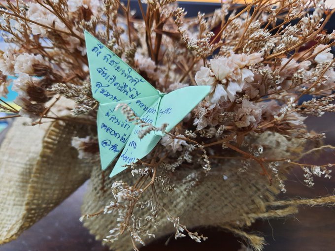 โดยการพับผีเสื้อกระดาษพร้อมเขียนคำอวยพร แล้วรวบรวมใส่ขวดโหล แล้วจัดส่งเป็นของขวัญในวันเกิดให้เฮีย