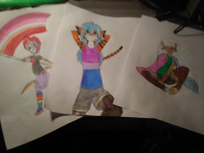 I drew and colored a few of my LGBT+ characters a few days ago but some stress had me hesitant to post them, doing better mentally now so here's some pictures!