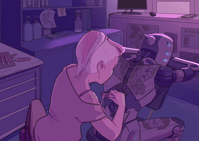 Saw this picture on Tumblr and now desperately want to play a robot in a sci fi RPG who spends their spoils on custom engraving 💜💚💙💗
