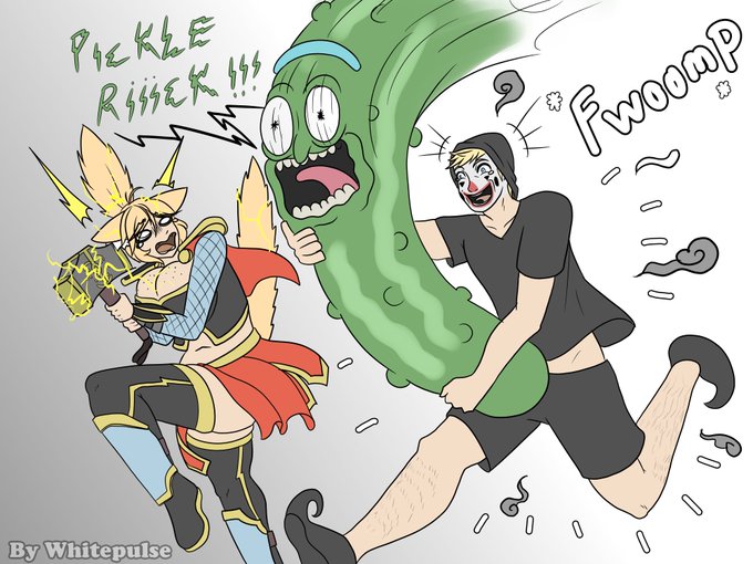 A little commission of Lola Scaring a cat with a pickle as is tradition.