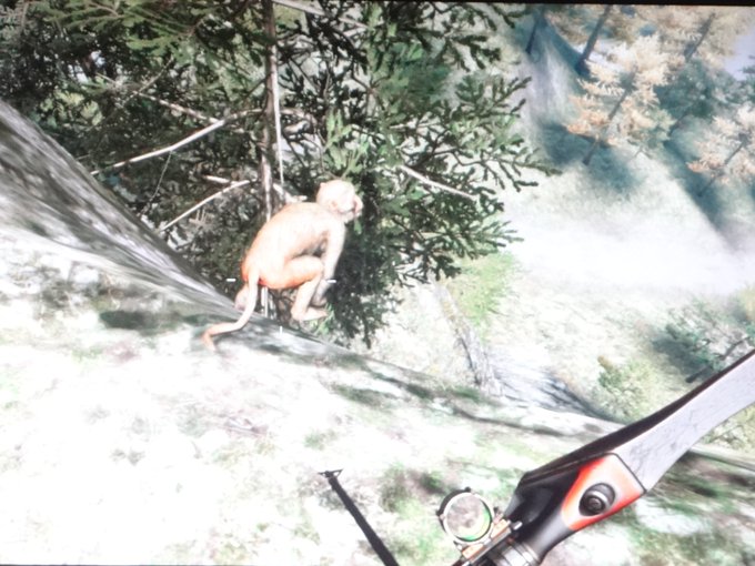 ファークライ4で 凄い所に居てるオサルさん発見! 尻尾だけで急な崖の上で休んでる(#^.^#)w