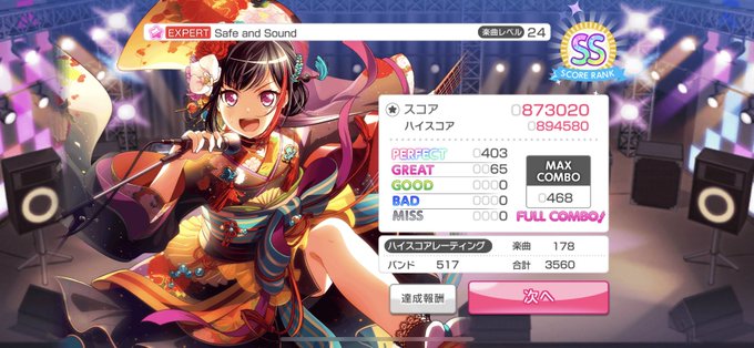 もう寝ないとな…… ガルパ始めて1ヶ月でランク93、Expertフルコン20曲達成!