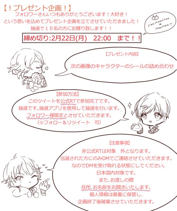 【!プレゼント企画!】 いつもフォロワーさんにお世話になっているので、感謝の気持ちを込めて全7種シールを作成しました!(自家製) フォロワー様10名の方にお贈りさせていただきます。 詳細は画像をご覧ください。 よろしくお願いします!