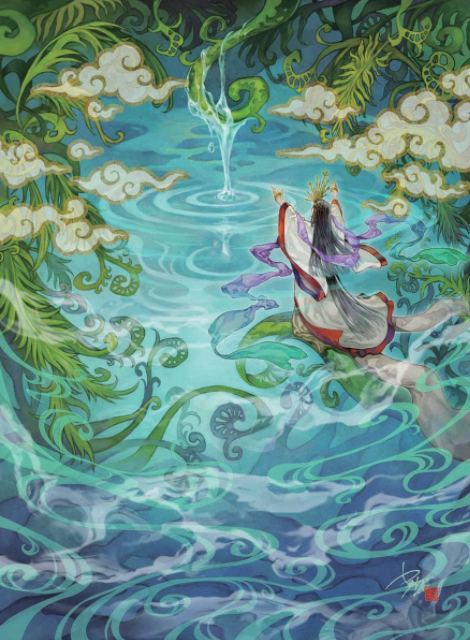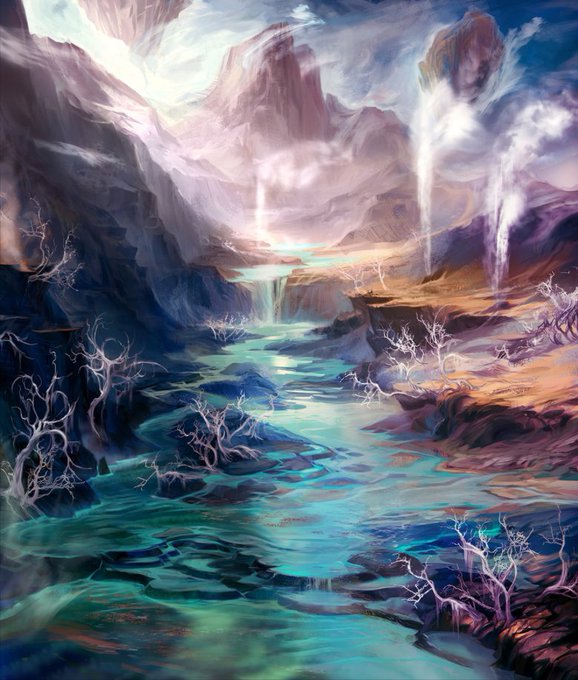 青緑のグラデーションが美しく、巫女のような人物が壮大な自然と調和をしているようでとても幻想的な一枚です!