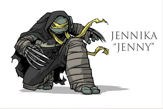 The answer is: YELLOW! But the question is, how does #Jennika get her bandana? You'll have to read #TMNT #97 to find out. I will say this: the scene and how it plays out is 100% dedicated to @mooncalfe1 (even she hasn't seen it yet!). Here are designs by Sophie and @theWoodenKing