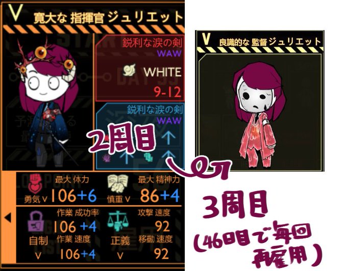 2周目からの再雇用職員3人。福祉チーム所属の気が付くと服がはだけてる系ナルシストのナラエ♂、設計チーフの言ってることはまともだけど顔と口調が怖いジュリエット♀、記録チームの良心の顔隠してればハキハキ喋れるオリバー♀じゃ〜 #ホラフキ支部