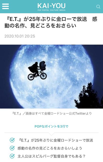 金曜ロードSHOW!に25年ぶりの帰還、 感動の名作『E.T.』✨ 10/2(金)21時~地上波放送を記念し、@KAI_YOU_ed にて特集記事を掲載していただきました。大好きな映画『E.T.』の見どころを書いております。 金曜の夜は是非、親子揃って金ローで最高の思い出を!✨📺🌕🚲👽 #金曜ロードSHOW #映画 #ET https://t.co/41ttnvOHKY