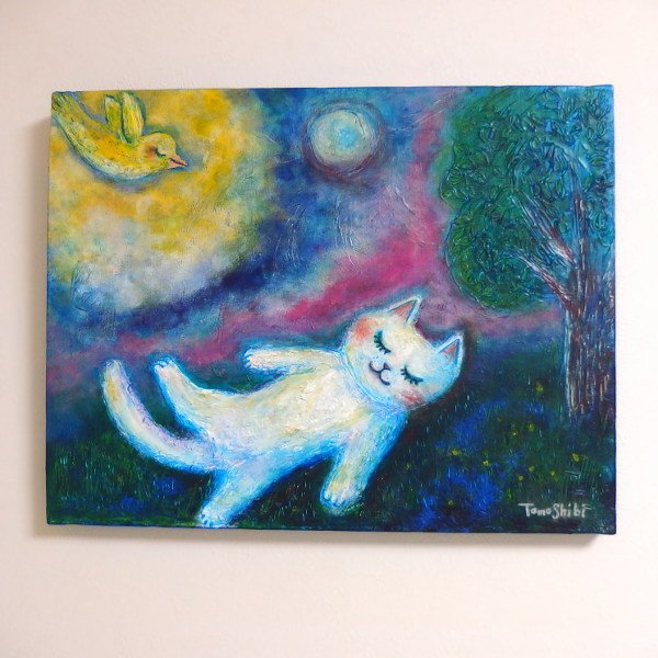 絵の具を盛り上げたり削ったりして 粘土細工のようなネコを描いてみました🙂 「おやすみにゃん」 F6号 Tomoshibi 2017 (410×318mm) #Creema新作 #Creemaブルー https://t.co/i6geRrxn6m