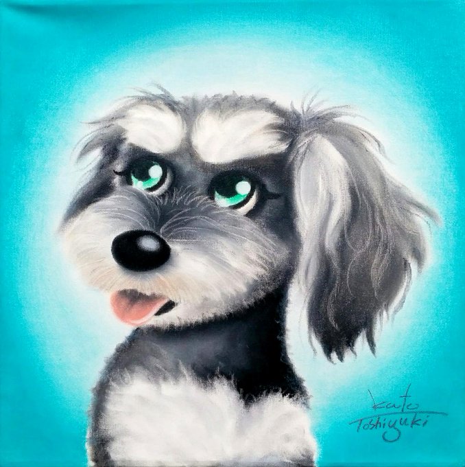 #ミニチュアシュナウザー のシオちゃんデス💕いやぁ~かわいく描けたわぁ😍✨お客様に気に入ってもらうにはまず自分が気に入ってる事が大事。完成作品は自信をもってお渡しします。魂を込めて描いた作品は全て我が子。手放すのは少し寂しい。納品は嫁がせるような感覚です。かわいがってもらうんやで~