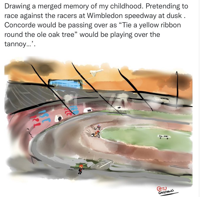 Drawing a merged memory of my childhood. Pretending to race against the racers at Wimbledon speedway at dusk . Concorde would be passing over as “Tie a yellow ribbon round the ole oak tree” would be playing over the tannoy…’.