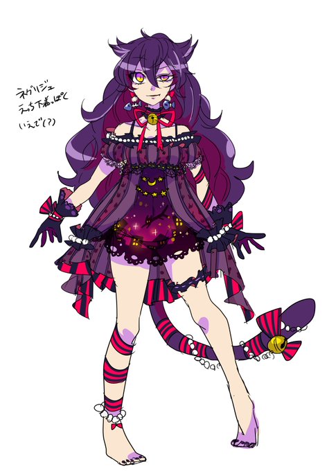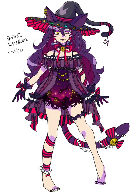 ねこの魔女さんの立ち絵だよ。 夜空の布地が透けてるどスケベ衣装。ねこではないけど自分のことねこだと思ってるから魚が好きだし、ねずみのおもちゃでじゃれて遊ぶよ。