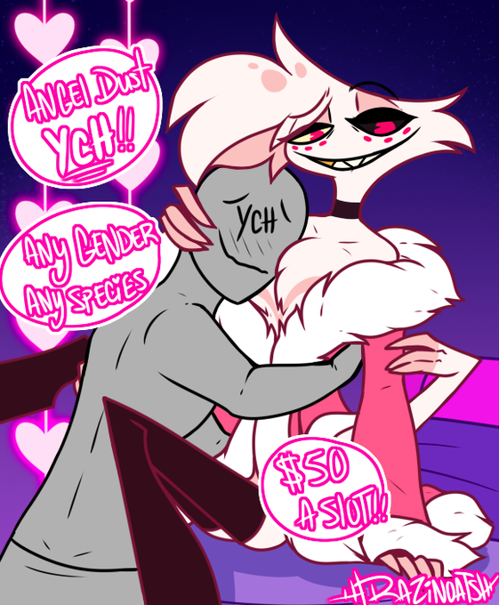 Heyo I gotta make rent so here's an Angel Dust Multi Slot YCH Any Gender, Any Species, Any size $50 a slot comment or DM to claim #AngelDust #YCH #HazbinHotel #commission #OCxCanon