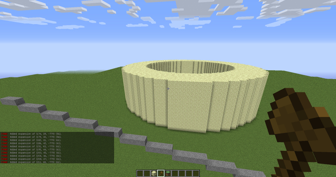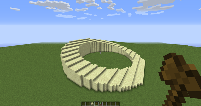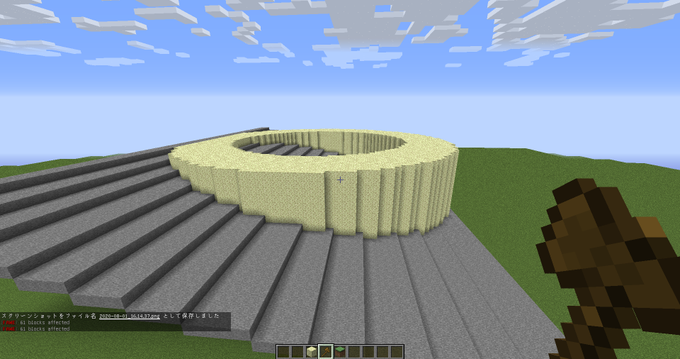 ちなみにこの斜め切り円柱ですが まず円柱を作り、その横にこのような感じで切りたいラインを設置 その後空気ブロックを含まずに切るように//stackした後 fuzzy選択で石と上部分を除去するとこんな感じになります #暇なときにやるFAWEコマンド