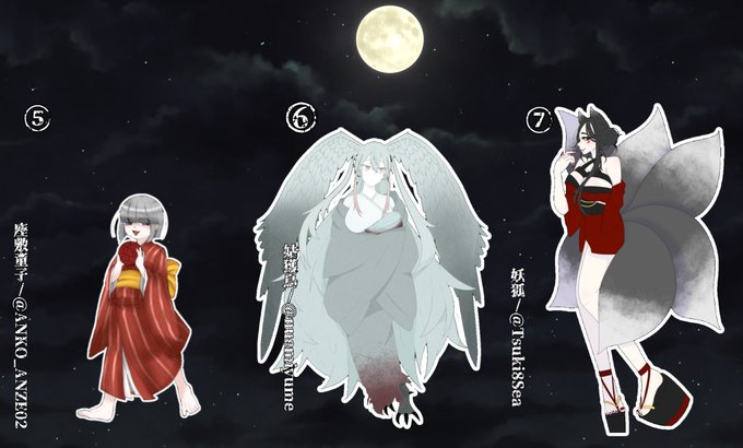 ささもちちゃん(@ sasanomomoti)主催の[百鬼夜行]誰デザに参加させてもらいましましま!! ツキが描かせてもらったのは⑦の綺麗な狐さん🦊 デザインしたのはどれか当ててね!!