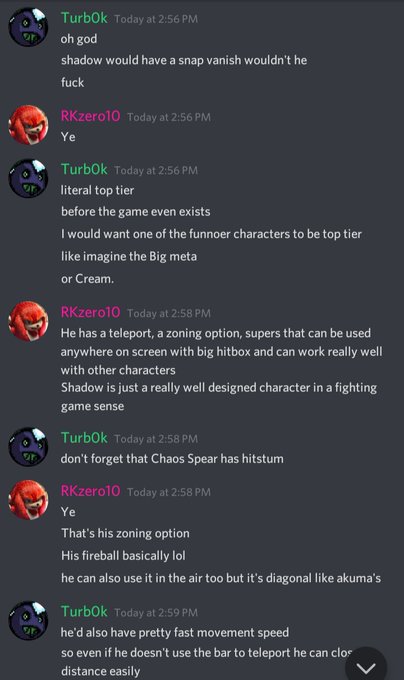 Discussing with @RKzero10 how Shadow would be the most busted character in a hypothetical 2D Sonic Fighter