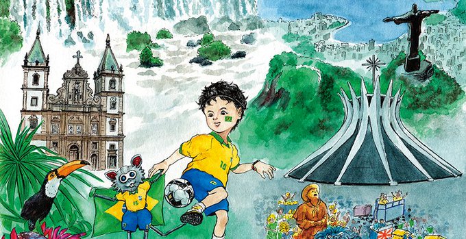 毎週木曜日の #読売kodomo新聞 2週目連載『世界まちがい発見旅行』第5回は #ブラジル(正解側の絵のみの公開)#サッカー #セレソン #イグアスの滝 #コルコバードの丘 #ブラジリア大聖堂 #リオのカーニバル #チーター #カピバラ #モルフォ蝶 #オニオオハシ #マラカナンスタジアム #サンフランシスコ教会