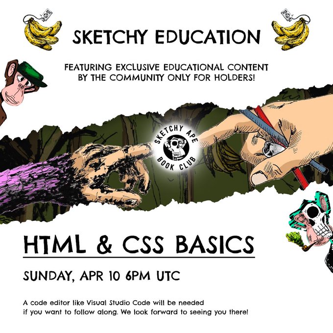 Did you know that you get access to educational content as a @SketchyApeBC holder?!?! We have had DAO, Figma, music fundamentals, NFT masterclass and more. I’m teaching HTML and CSS basics this Sunday #nftcommunity #web3 @sketchy_labs #SketchyApeBC