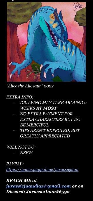 Laying out commissions again, this time without the document, for a less clunky view. I draw dinosaurs, OCs, and like to experiment with coloration.