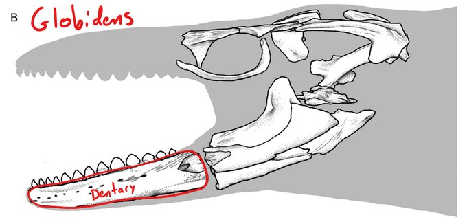 Second, the dentaries (tooth-bearing bones of the lower jaw) are relatively short compared to other mosasaurs (i.e., Tylosaurus), much like in today’s shell-crushing lizards, incl. the caiman lizard (Dracaena) & Nile monitor (Varanus)!