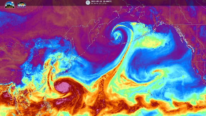 The remnants of TS #Merbok have entered the Bering Sea pulling an impressive #AtmosphericRiver north from the tropics. Strong winds (potentially hurricane force) high surf, coastal flooding and heavy rains will impact southern Alaska this weekend. https://t.co/SGeztR6wfo #AKwx