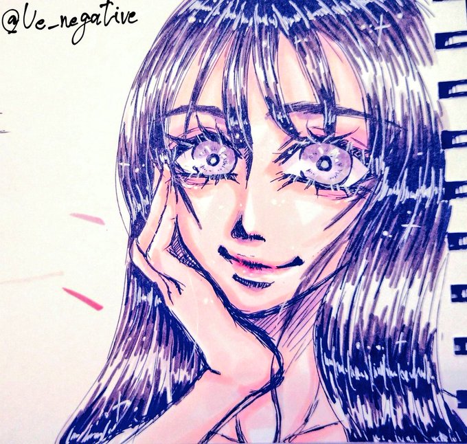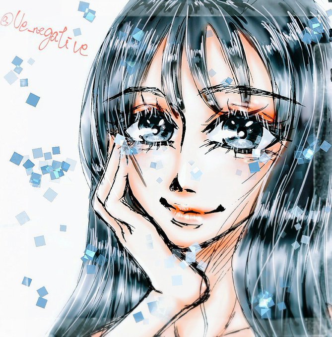 アナログからデジタルに加筆修正してみたその3 ちょっと目を光らせ過ぎたかな いや逆にアイシャドウとかリップをもっと濃くしてもっと光らせてもよかったかなー ツヤツヤ黒髪は正義 #創作イラスト #落書き