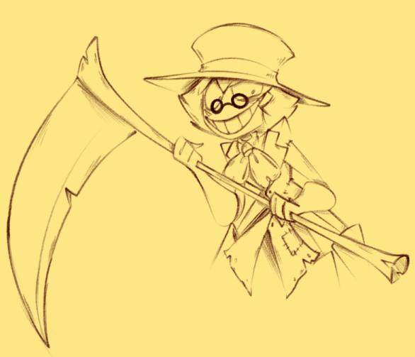 The first sketches I made for a new-ish OC called The Harvestman! He's a fan character for a game called Bug Buzz. He's a sneaky criminal with a scythe. It's neat to see his development over time!