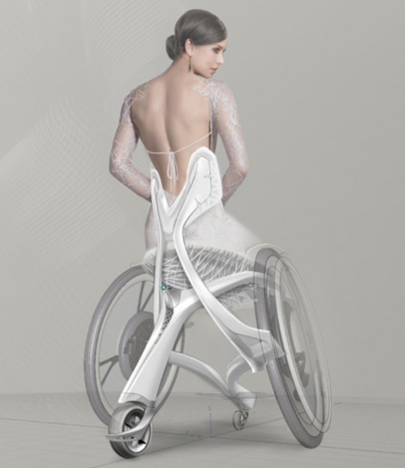 全体がドレスの“Aライン”を描くことを考え、人と車いすの一体感を目指し、座った姿勢が美しく、ハイヒールの脚を揃えておくことができて、背中がきれいに見える」ことを追求したそうです