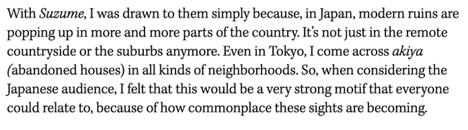 Suzume director Shinkai Makoto gave a frank and intriguing interview with the Hollywood Reporter in anticipation of the film's Intl. premier at the Berlin Film Festival on Feb. 23rd - discussing the film's themes of the depopulation and emptying out of the Japanese countryside.