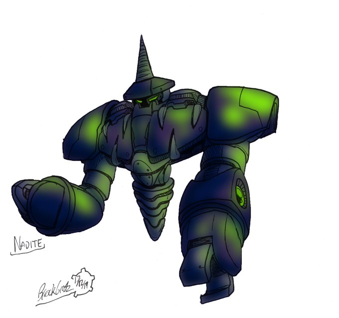 Nadite is an industrial robot who can operate in extreme environments like irradiated pools or space, and currently masquerades as a deity. Her body conceals several additional arms and implements for work and battle.