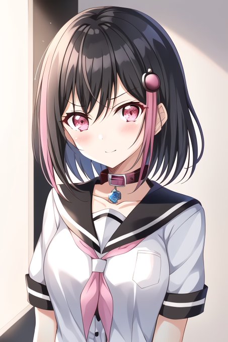 1girl, {{{{mitake ran}}}}, {{bang dream!}}, black hair, short hair, parted bangs, bangs, pink eyes, school uniform, collar,best quality,evil