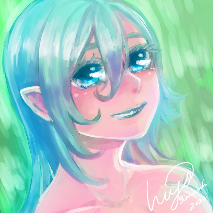 何も考えずに描くとこの顔になる。特に設定も何もないんだけど、青色エルフちゃん。#落書き #エルフ