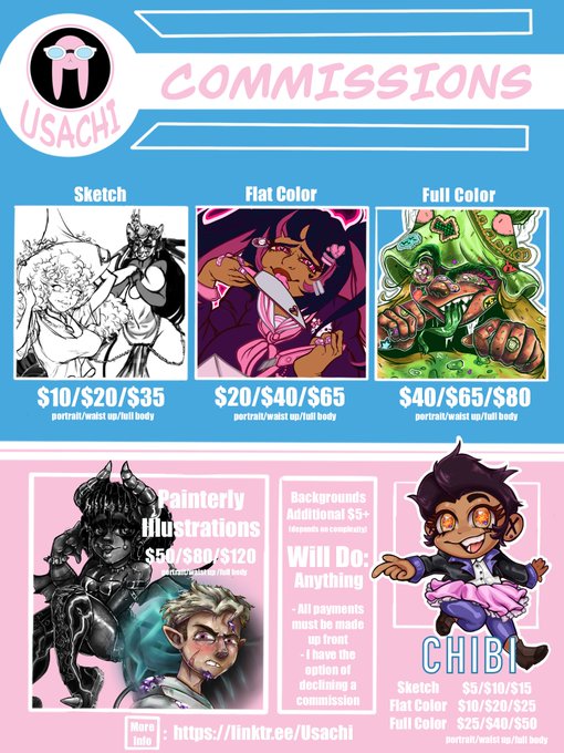 Sketches, lineart and flat color, or even fully shaded illustrations of your favorite characters or ocs! I can even do portraits of you in my own style!