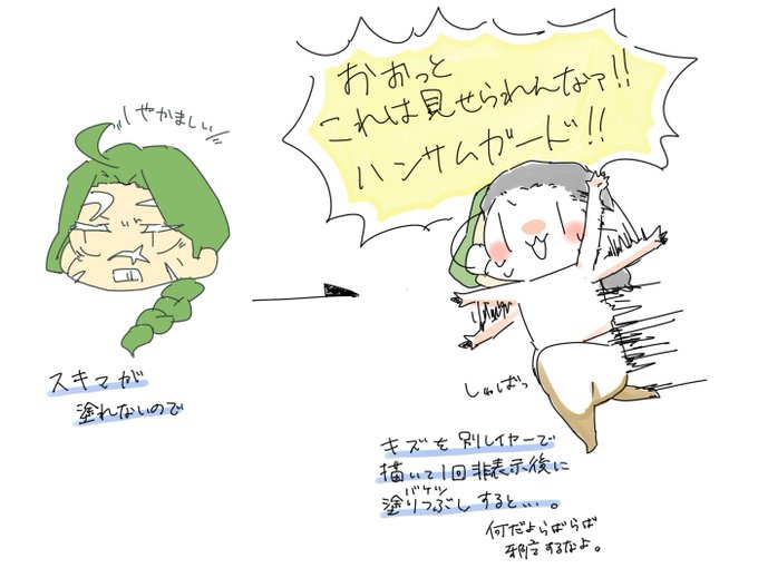 今デーボさん描いてるんだけど肌の色塗りつぶす時に傷ごと描いてると塗りつぶした時に隙間ができるから一回傷の線画を別レイヤーに描いてそれを非表示にして塗れば綺麗に肌を塗れるんだよっていうのを図で表そうとした。