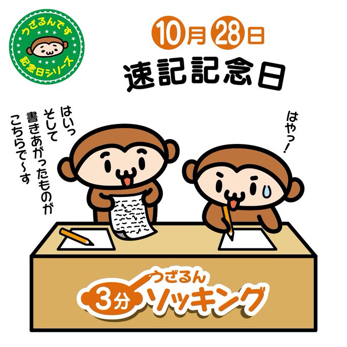 ♪( ´▽`)10月28日は速記記念日。速記とは簡単な記号のような文字を使って演説などを素早く書き取ることです。早口の人だとたいへんですよね。でも大丈夫!この下にもう書いたものを用意して…?