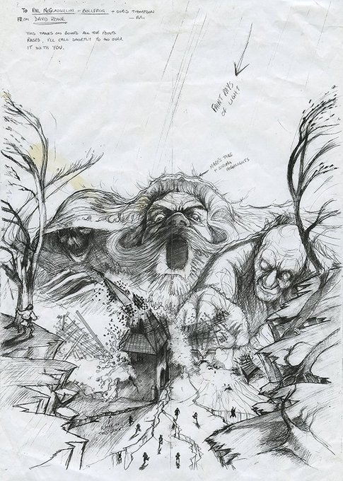 Rough drafts for the cover art of Populous, Shadow of the Beast III and Populous II by David Rowe: