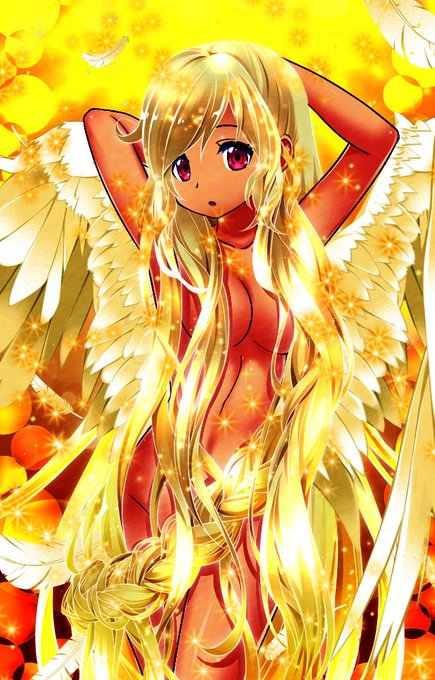 @Lovecrambon ガンマ値を下げれば金髪の質感は出ますが肌やその他が暗くなるのが問題でした。ならば逆光表現にすればいいじゃないと背景のみ明るくして、背景と人物の中間になる『透過する光』を翼で表現しました。羽はそのままだと青白くなってしまうので色相補正して背景の黄金色に合わせました