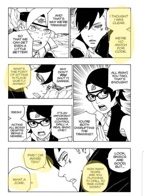 I guess this chunin exam is the reason for kawaki attitude in cha 58. It seems no one in the exam have gived him a hope on defeating Code. He keep worrying and want to get stronger ( for all ) . He seems to only have hope in #boruto, but not believe in the ninja training system.