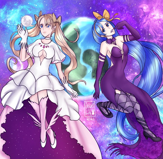 Crystal and her sister Eclipse are like light and dark, and have two different ideas of how to interact with planets. It’s no surprise then that together they decided to go as Madokami and Homucifer for Halloween! 🌎 #giantess #sizetwitter