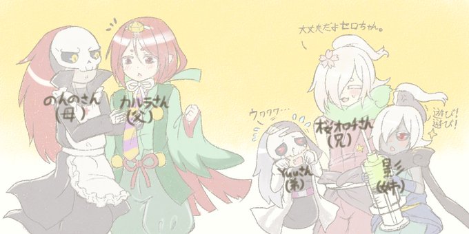 のんのさんのフォロワー家族を描ました。(「妖怪」印象で) 父:@kaluratengu 母:@himenohinathan 兄:@sakura_orochi 姉:@Venoct_shadow 弟:@Originator_HRK
