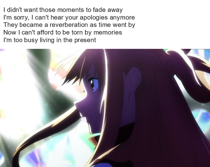 However, it seems that something is happening between the two of them, Asuna no longer wants her apologies, she doesn't want to be affected by their memories, because she is now focused on living in the present. Her present is now Kirito, because the last chorus is about him.