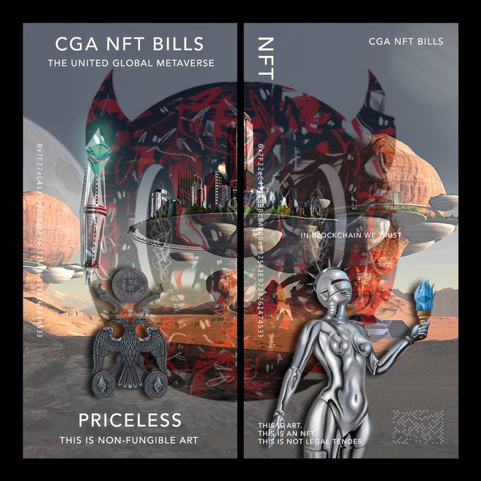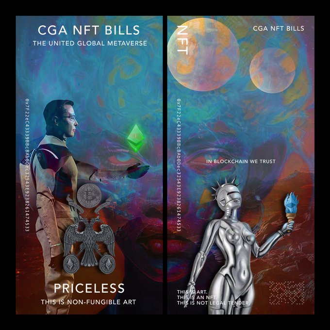 CGA BILLS by @TheCryptoGems allows you to mint a bill using underlying art of one of your favorite nfts/creators. 3 different bills to choose from. My first 3 were minted using the creations of @todayodious @zakalwe_x & @Erdemct. How do they look? #nft #nftart #cryptoart