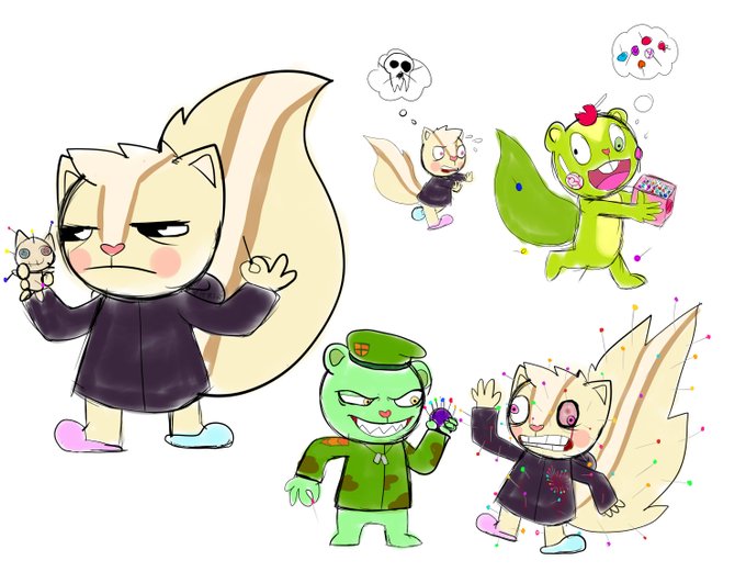Skinki se la vive intentando que los demás no se maten (por lo general muere por esto) pero es mega vengativo, usando el vudú...no saben cuantas veces a intentado quitarle el retraso a Lumpy y sus trastornos a Flippy