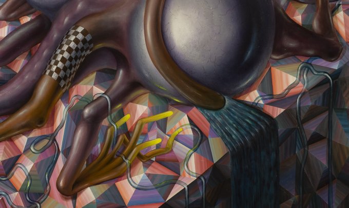 The left side of Designoid 2C. This painting is a part of the #DESIGNOIDs series which is in progress since 2017. Still adding new creatures to it. The term "Designoid" was coined by Richard Dawkins and describes something that came up by accident but appears to be designed.