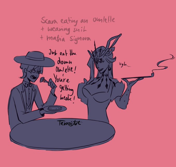 Then we got Venti and a Slime, maid cat boy, Scara eating an omelette and hating it while wearing a suit (also kinda mafia au?) +Signora