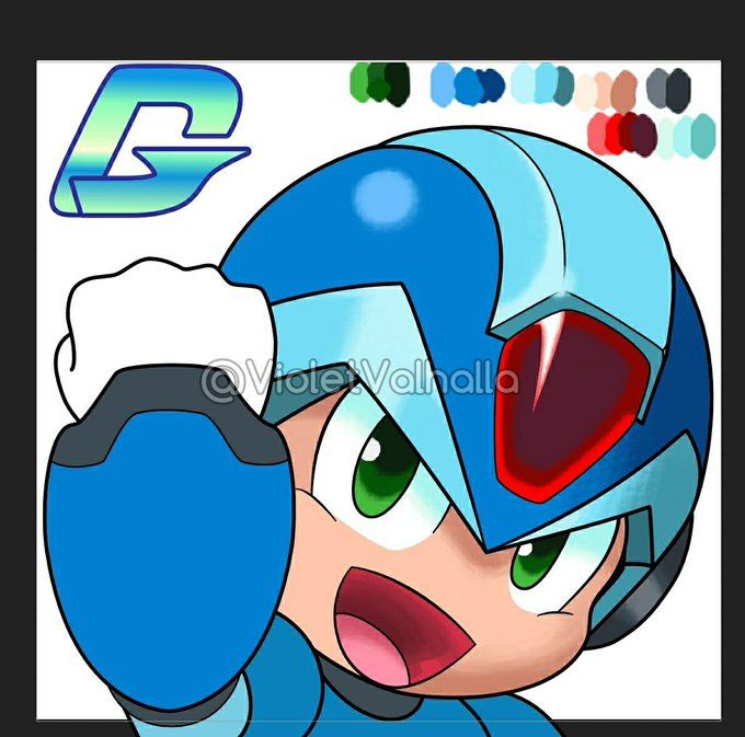 More progress with this #MegaManX GG #Twitch emote. I made some changes. I also liked the idea of making the GG look like the "READY" font from MMX4. I still need to fix his arm and finish shading. #rockmanx #digitalart