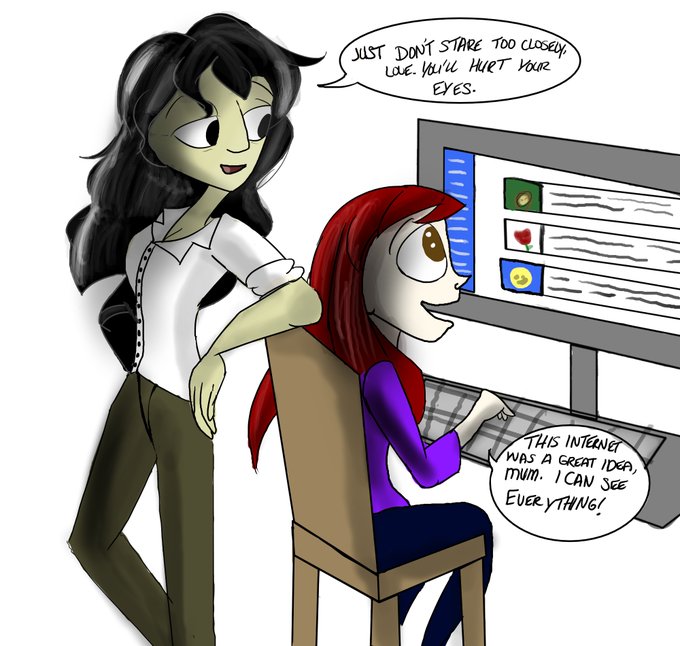 A little gift for @Scrapnic, featuring her Boxtrolls OC, Payton teaching my young Boxtrolls OC Pepper, now a teen, about the internet. We met over tumblr and had great times together. I hope this helps you feel better! Love you, friendo!
