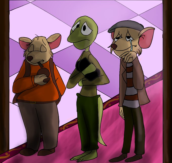1 of my earliest pieces w/ a tablet was my 3 fav boys from Great Mouse Detective in a sketch app. Now after 2 years, I did them in Krita. A fanfic writer I know once labelled them as Red, Bill, & Snakes; whatevs the case, gotta 💙 the respects they pay to their fallen comrade.