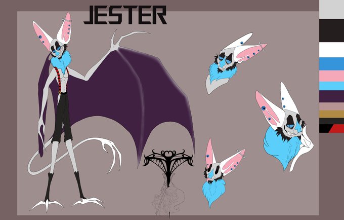 Finally got to finishing up the sheets for mine and my wifes Hazbin Sona's, Jester and Peach! A female yeen with the pan flag, and a leaf nose trans bat with colors from both the ace and trans flag for me.~