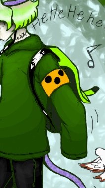Muta has an orange armband with three black dots on it, this is used to tell others that this person has a disability that can be dangerous near traffic. (in Muta's case blindness)