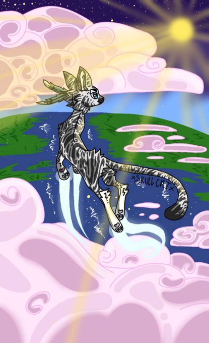 How mythical! It’s Jayfeather, floating in the sky with pink clouds. This piece reminds me of the “Man on the Moon” MAP! Be sure to leave a like on the original.